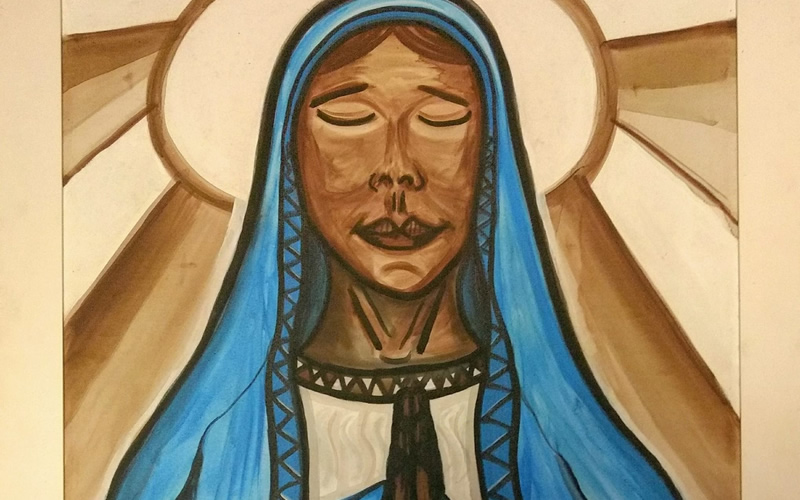 Depois de tempos sem pintar, eu comprei essa tela em 2008, não sabia o que pintar, e de repente vi a imagem de Nossa Senhora na tela branca.